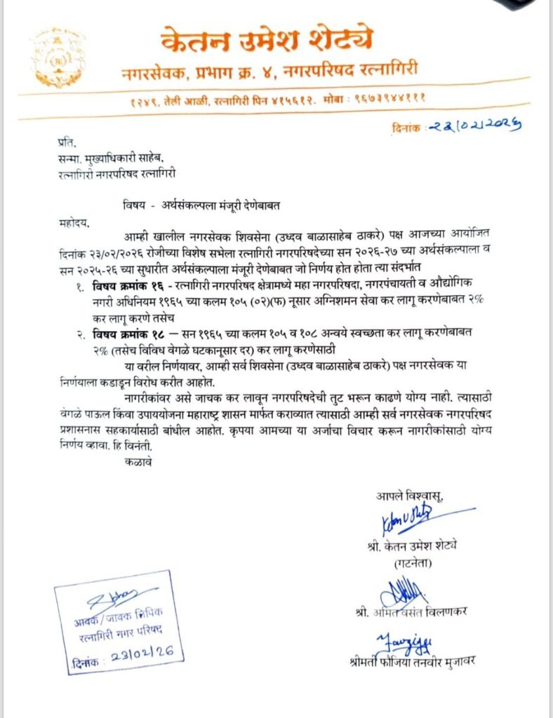 नगरपरिषदेने कायद्याचा आधार घेत ही करवाढ सुचवली असली, तरी ठाकरे गटाच्या नगरसेवकांनी याला ‘जाचक करवाढ’ म्हणत जोरदार विरोध दर्शवला आहे. गटनेते केतन शेट्ये, अमित विलणकर आणि फौजिया मुजावर यांनी आक्रमक पवित्रा घेत प्रशासनाला लेखी निवेदन सादर केले.