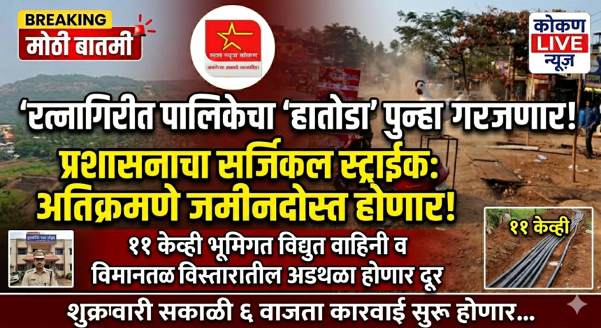 रत्नागिरी शहरातील चर्मालय ते कोकणनगर या अत्यंत महत्त्वाच्या मार्गावरील प्रलंबित अतिक्रमणे हटवण्यासाठी रत्नागिरी नगर परिषद आता पूर्णपणे ‘ॲक्शन मोड’मध्ये आली आहे वारंवार सूचना देऊनही अनधिकृत बांधकामे न हटवल्याने, येत्या शुक्रवारपासून (६ मार्च) या मार्गावरील बेकायदेशीर गाळे आणि बांधकामांवर पालिकेचा हातोडा चालणार आहे.